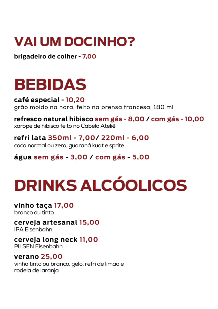 Uncategorized 26 de junho de 2024 Cardápio e Horários da Cozinha Comidinhas e bebidinhas delícia pra sua experiência ser ainda melhor! ❤️ Horário da cozinha: Terças e quartas das 13h as 19:00h – Quintas das 9h as 15:30h – Sexta das 11h as 19h – Sábados das 9h as 17:30h.